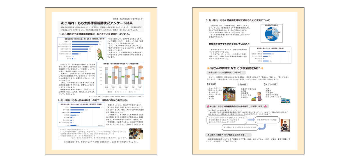 令和7年5月、あっ晴れ!もも太郎体操をしている団体の活動の様子を把握するために、アンケート調査をおこないました。団体の現状や活動を継続するための工夫を載せていますので、今後の活動にご活用ください。