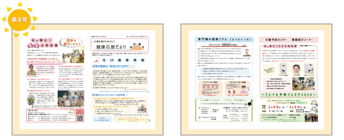 「健康応援だより はれ晴れ」 は、健康づくりに関する さまざまな情報や、岡山市ふれあい介護予防センターの事業紹介などを発信する広報誌です。