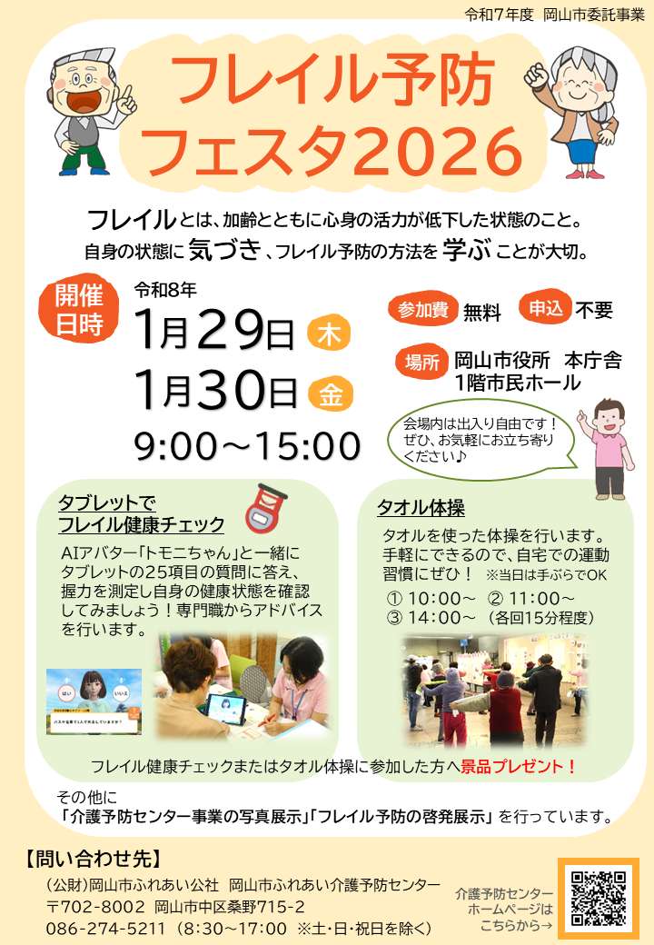 「気づく」ためには、まず「知る」ことから!岡山市民の皆さんにフレイルについてもっと知ってもらうため、令和8年1月29日(木)・1月30日(金)に、岡山市役所本庁舎1階の市民ホールで「フレイル予防フェスタ2026」イベントを開催します!