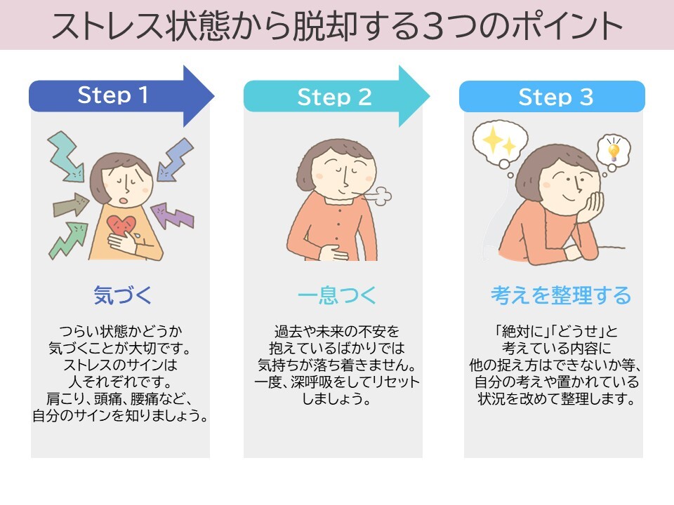 このように3つの段階を踏むことで、思考の偏りが和らぎ、ストレス状態から抜け出すきっかけになります。