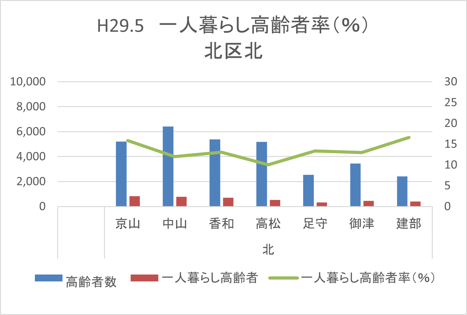 | 一人暮らし高齢者率(%) | 23.5 | 15.6 | 20.9 | 20.4 | 26.1 | 12.8 | 12.9 |