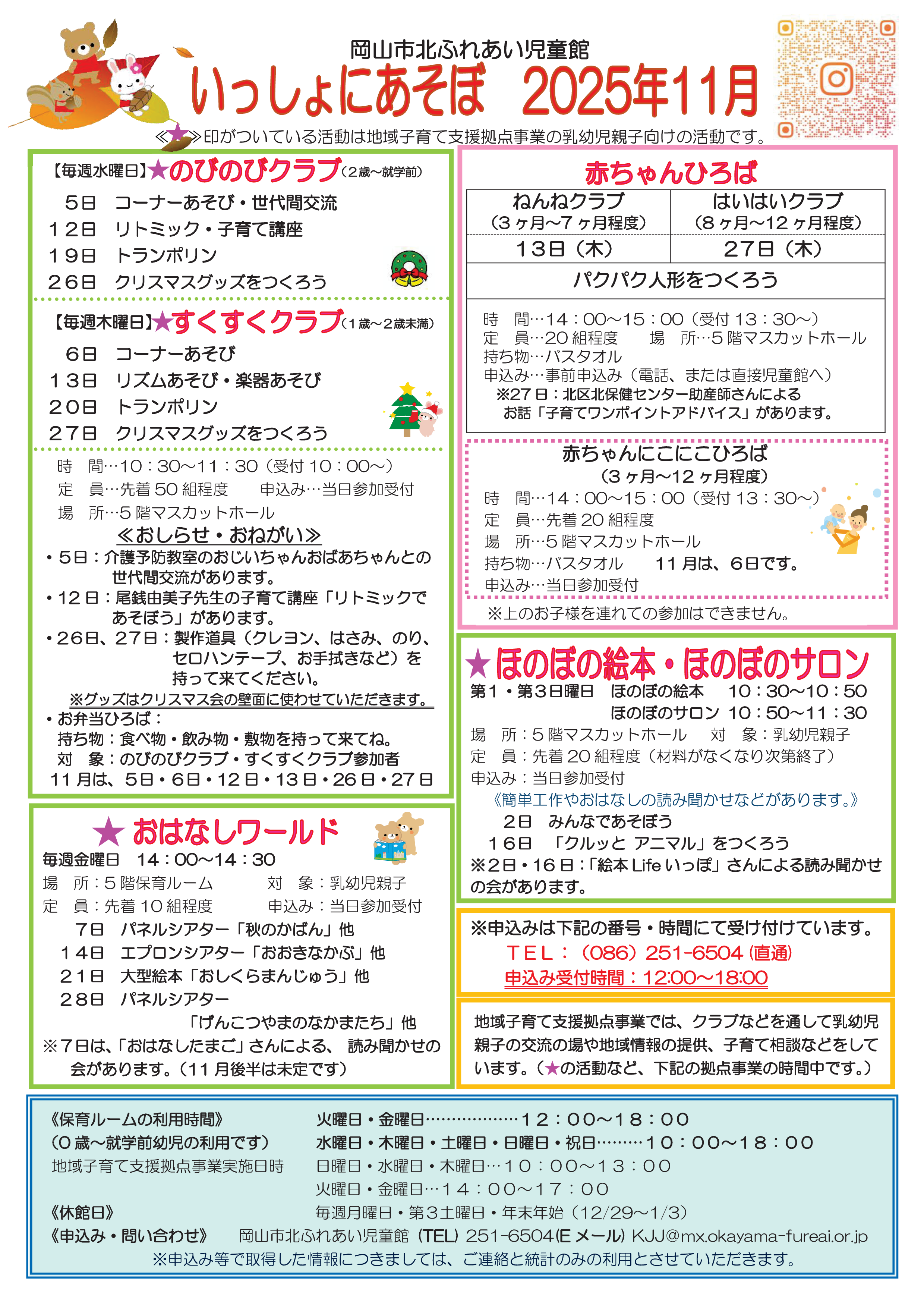 11月のおべんとうひろばは、5日、6日、12日、13日、26日、27日に実施します。