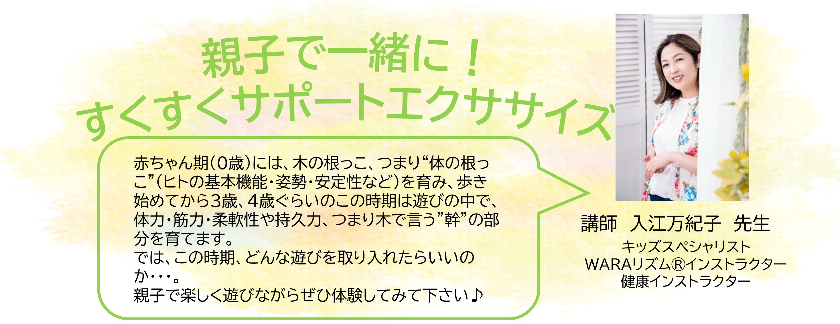 赤ちゃん期(0歳)には、木の根っこ、つまり”体の根っこ”(ヒトの基本機能・姿勢・安定性など)を育み、歩き始めてから3歳、4歳ぐらいのこの時期は遊びの中で、体力・筋力・柔軟性や持久力、つまり木で言う”幹”の部分を育てます。