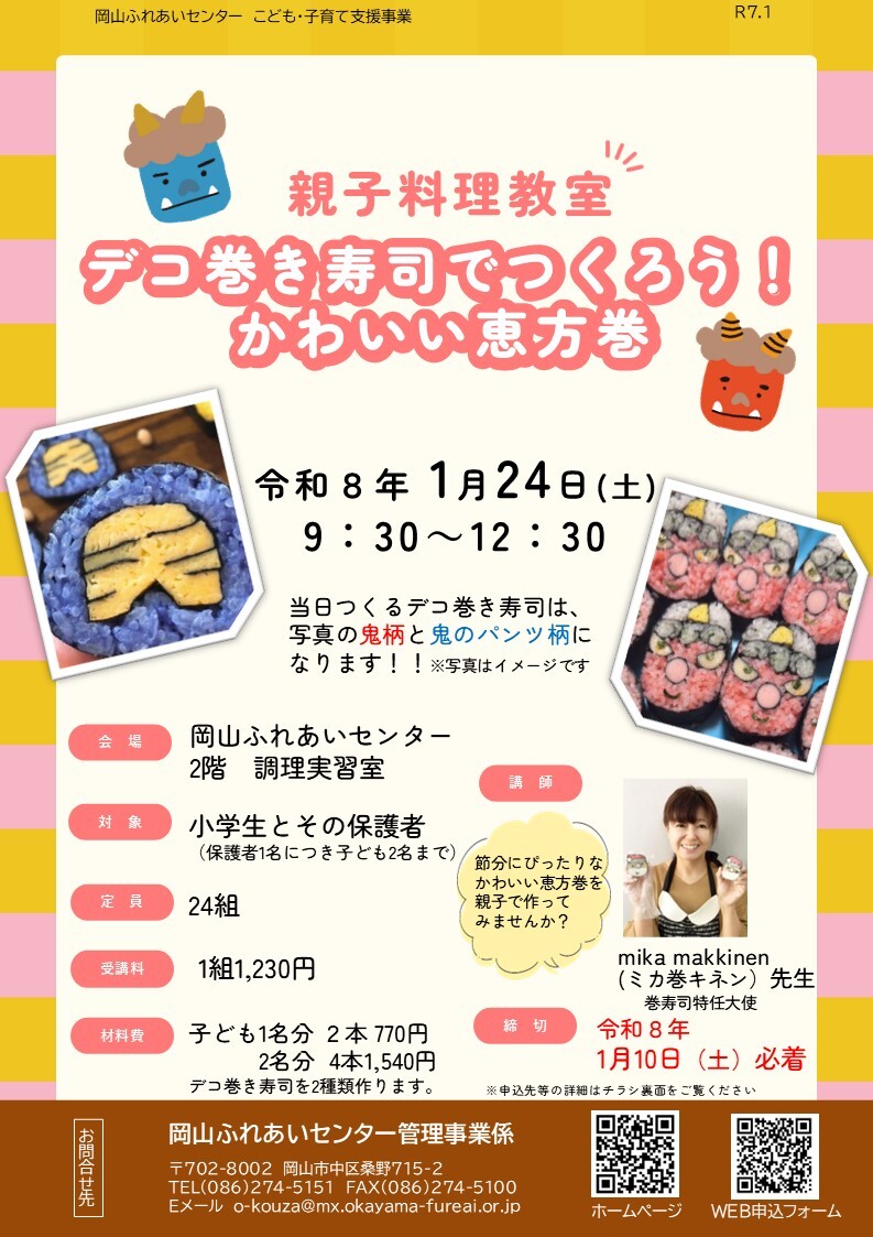 節分にぴったりなかわいい恵方巻を親子で一緒に作ってみませんか?ハーフサイズの太巻で、各柄一本ずつ巻いていきます。巻き寿司をつくりながら親子で楽しい時間を過ごしましょう。
