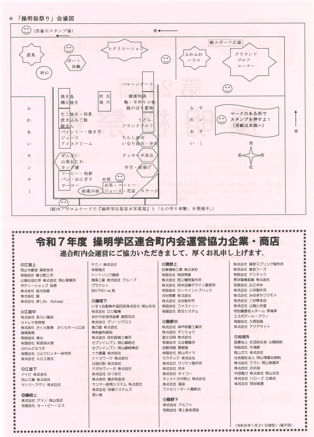 このたびは、第24回 操明桜祭りにご参加いただき、誠にありがとうございました。皆さまのおかげで、無事にイベントを終了することができました。当日ご来場いただいた皆さま、並びに関係者の皆さまに、心より感謝申し上げます。今後とも、より良いイベントを企画してまいりますので、引き続きよろしくお願いいたします。