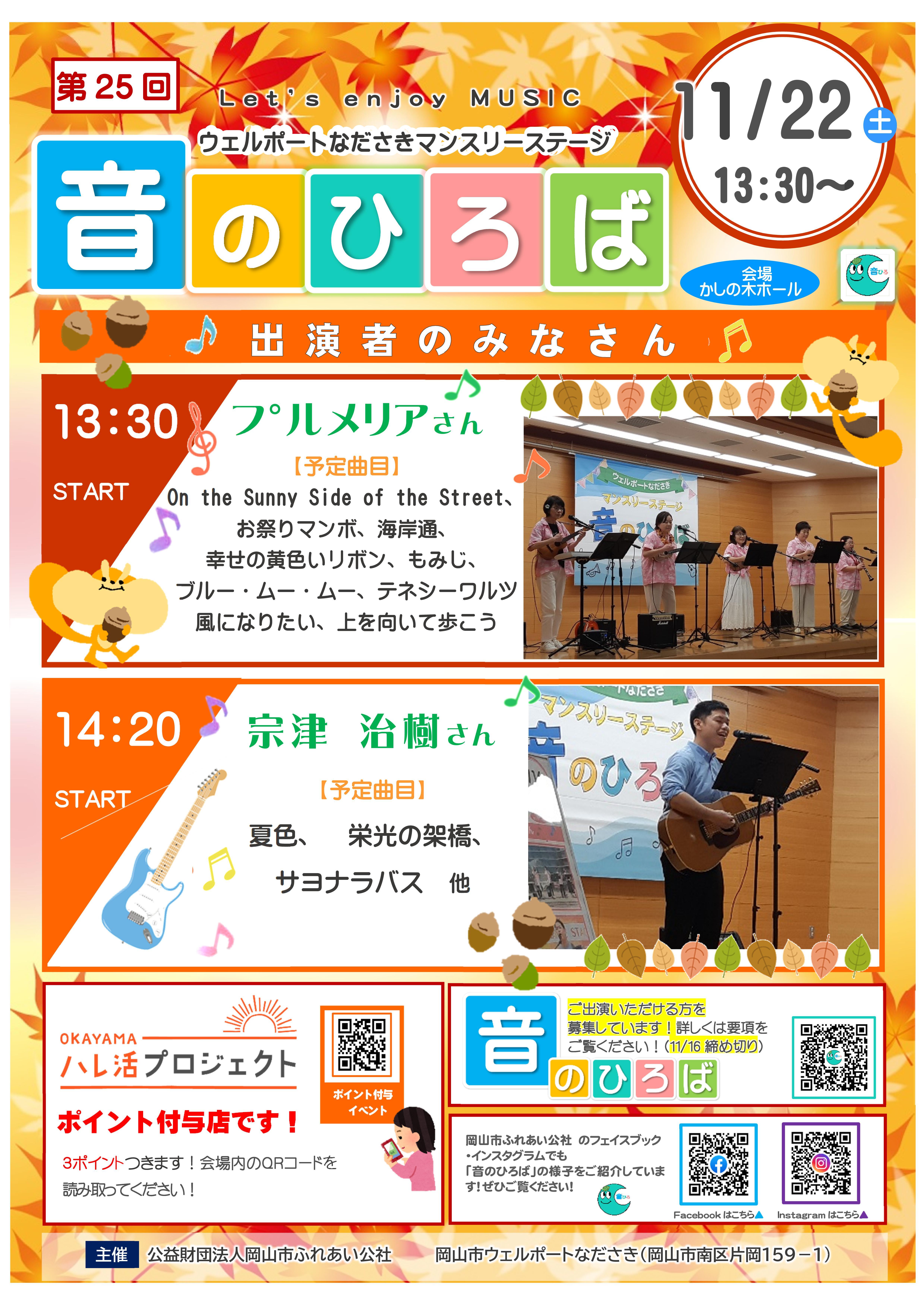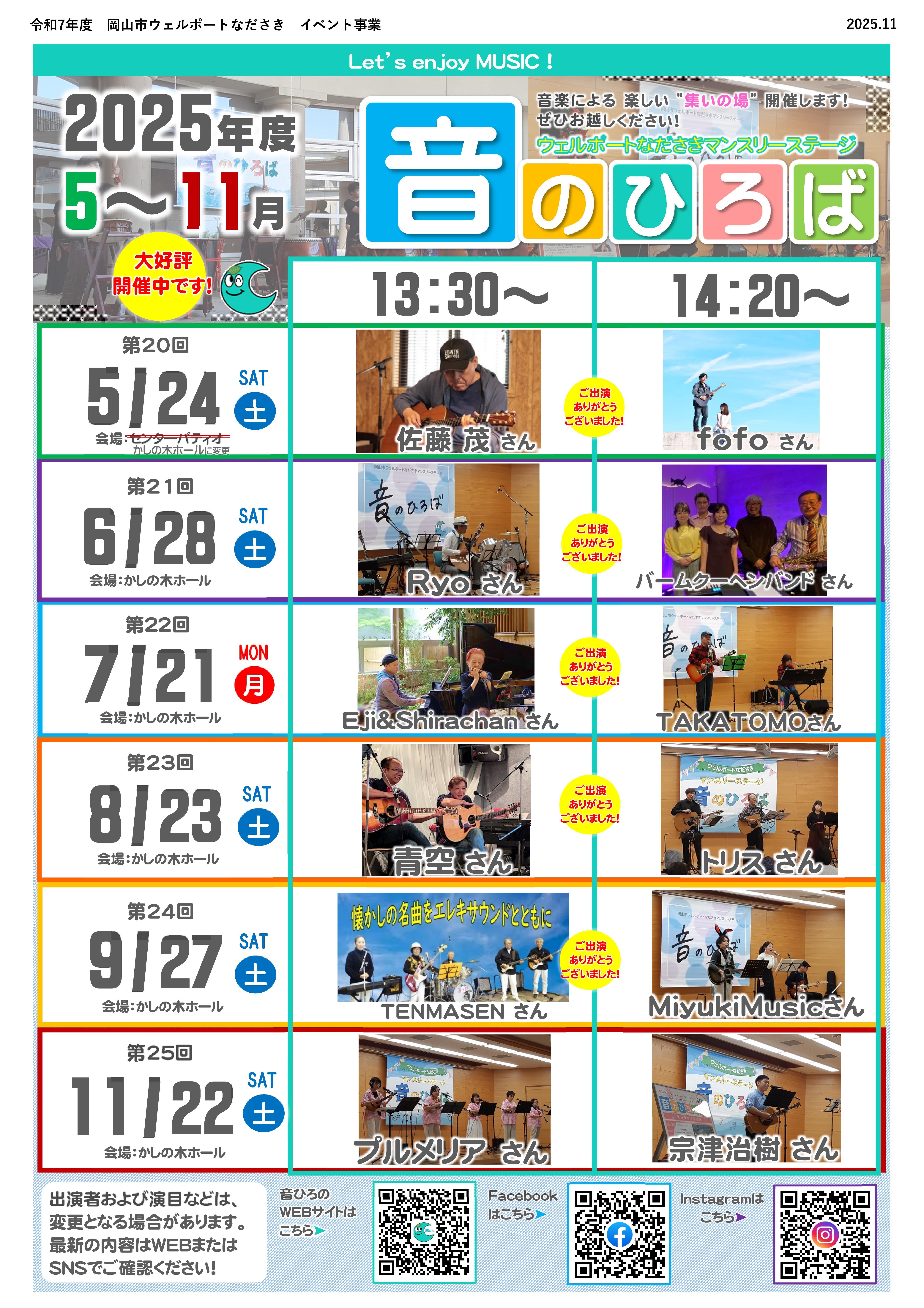 岡山市ウェルポートなださき マンスリーステージ「音のひろば」令和7年度 前期 5月から11月まで(全6回)、