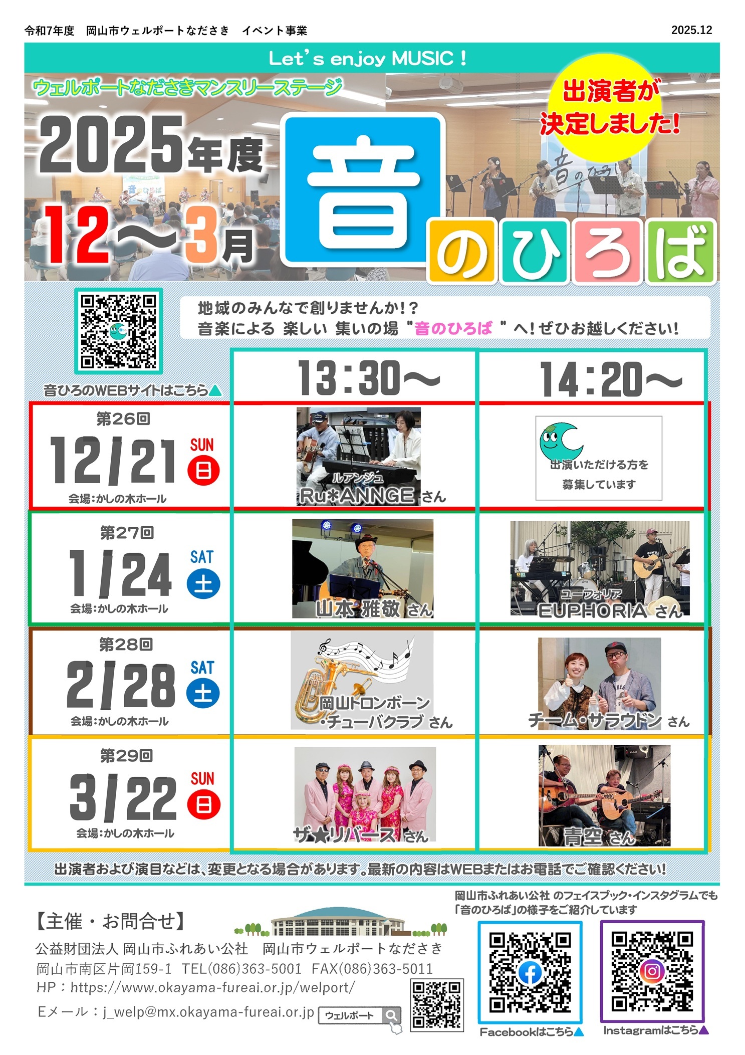 岡山市ウェルポートなださき マンスリーステージ「音のひろば」令和7年度 後期 12月から3月まで(全4回)、