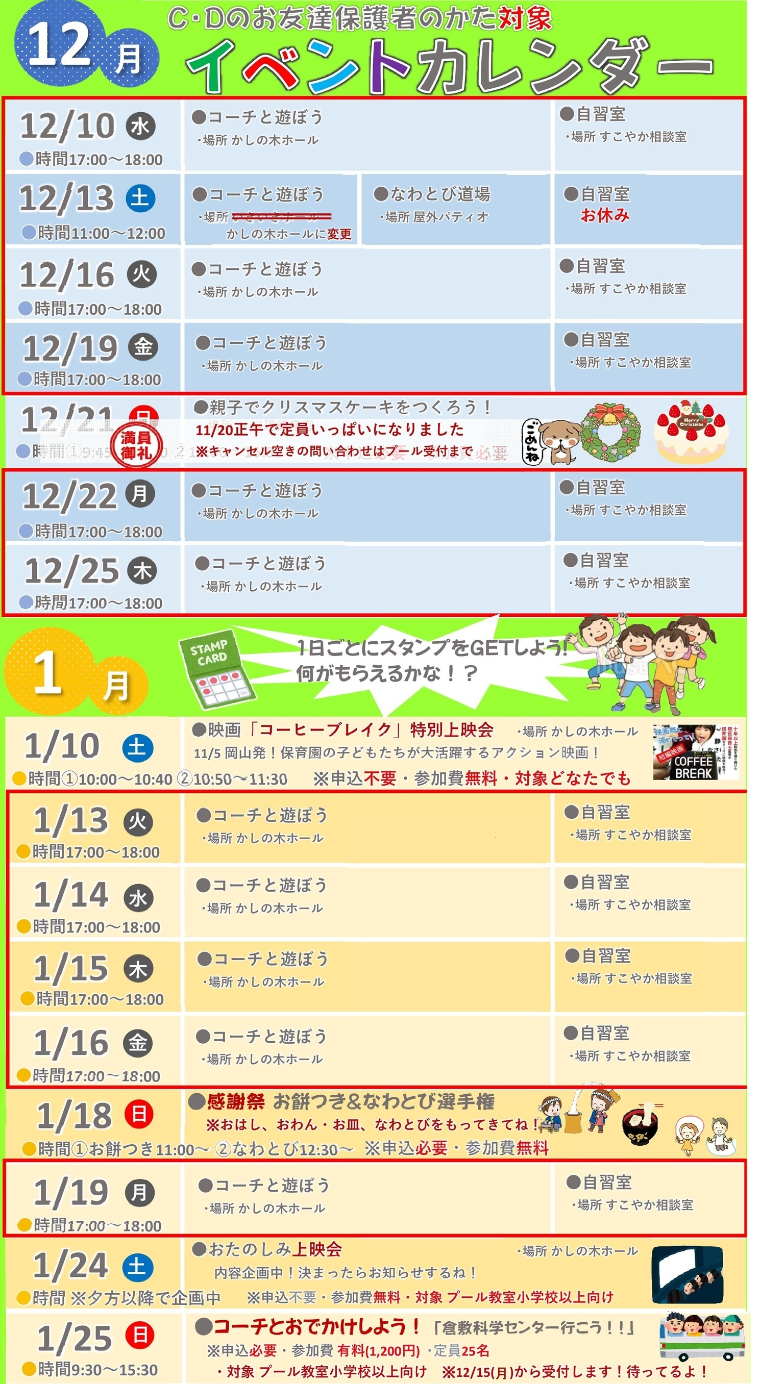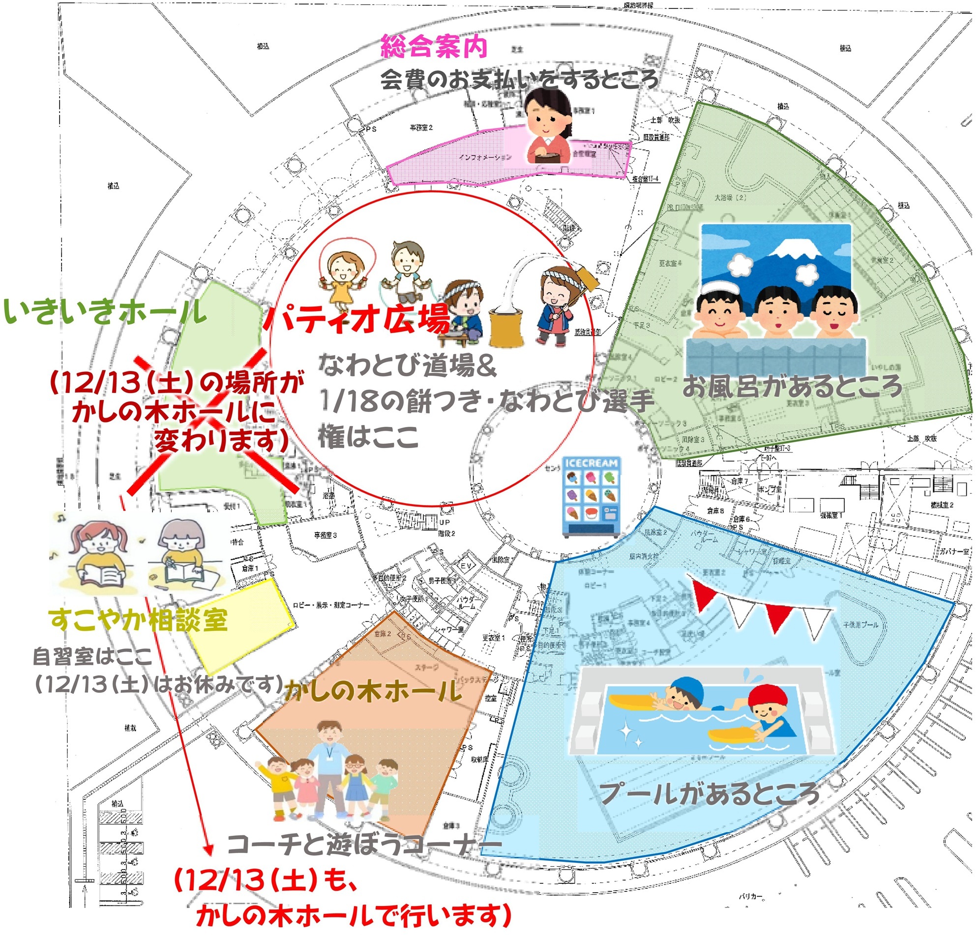 • 「コーチと遊ぼう」のコーナーは、1F「かしの木ホール全ての回12月13日も1F「かしの木ホール」に変更になりました)で、